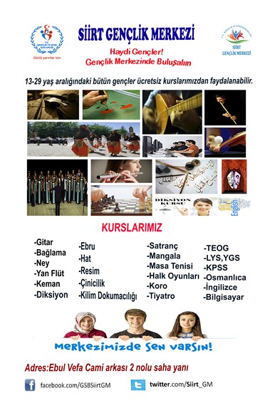 Gençlik Merkezinde açılacak olan kurslarda 13-29 yaş arasındaki gençlere; YGS, KPSS, Ney, Yan Flüt, Gitar, Keman, Bağlama, Halk Oyunları, Tiyatro, Koro, Masa Tenisi, Satranç, Mangala, Ebru, Hat, Osmanlıca, Tezhip, Çini İşlemeciliği, Ahşap Boyama, Diksiyon, Resim, İngilizce, Bilgisayar branşlarında eğitim verilecek.